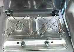 zweiflammige Kochmulde aus Edelstahl ist mit einer Rauchglasabdeckung versehen.